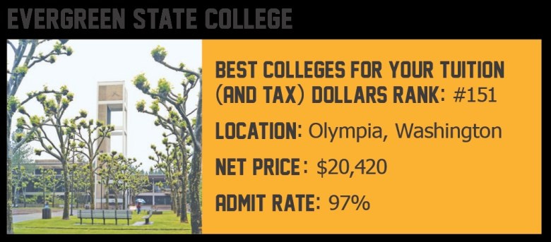 Almost everyone who applies gets in. Of Evergreen’s 2,505 students, a third are on Pell Grants. Though the college has a fairly high net price of $20,420, its graduates leave without a crushing amount of debt. It only gets better from there. Evergreen graduates greatly overperform in earnings, making almost $11,000 more in their early careers than peers with similar educations and socioeconomic backgrounds. Many go on to earn PhDs and to participate in national service programs like AmeriCorps and the Peace Corps.
