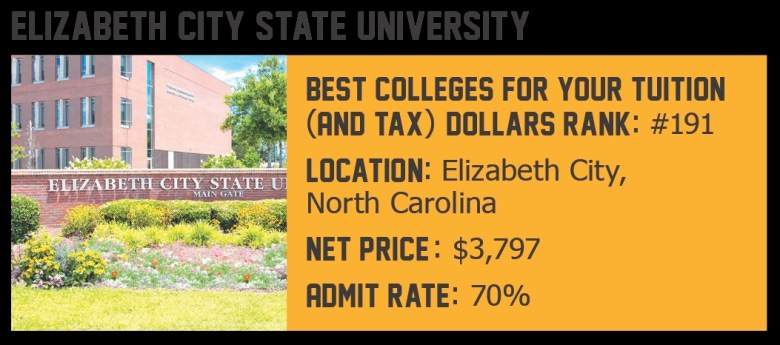 Elizabeth City is an old favorite in the Monthly’s College Guide. Back in 2012, it topped our list of baccalaureate-granting institutions, and this year it cracks the top 200 thanks to the extraordinarily low cost at which it provides an education.