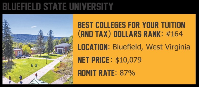 Close to half of Bluefield’s 1,300 students are on Pell Grants. Admission is fairly easy; 87 percent of applicants are accepted. They pay a respectable amount ($10,079 when factoring in loans), graduate at higher rates than expected, and do so without crushing debt. In all of those statistics, Bluefield has a rank around 200—a strong performance out of more than 1,400 schools, and a deeply valuable contribution in a community where roughly one in five people lives in poverty.